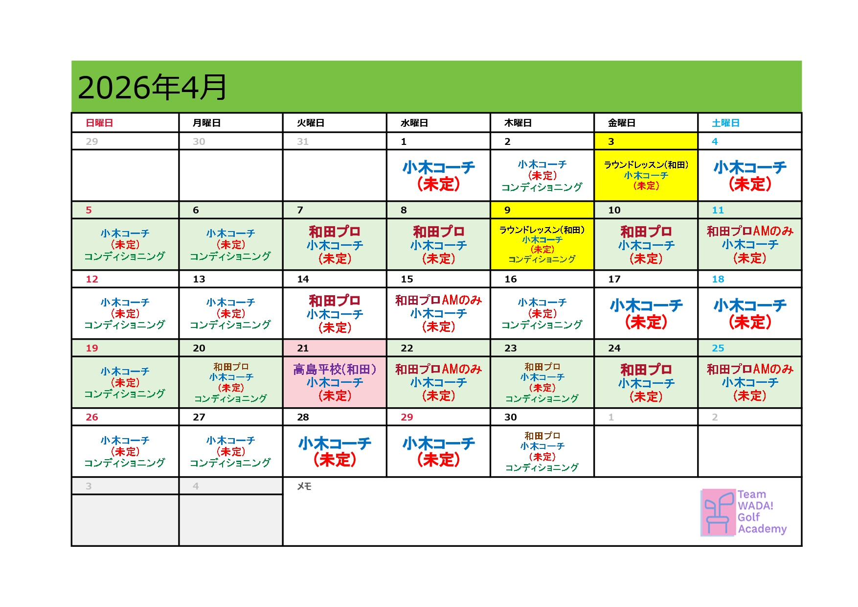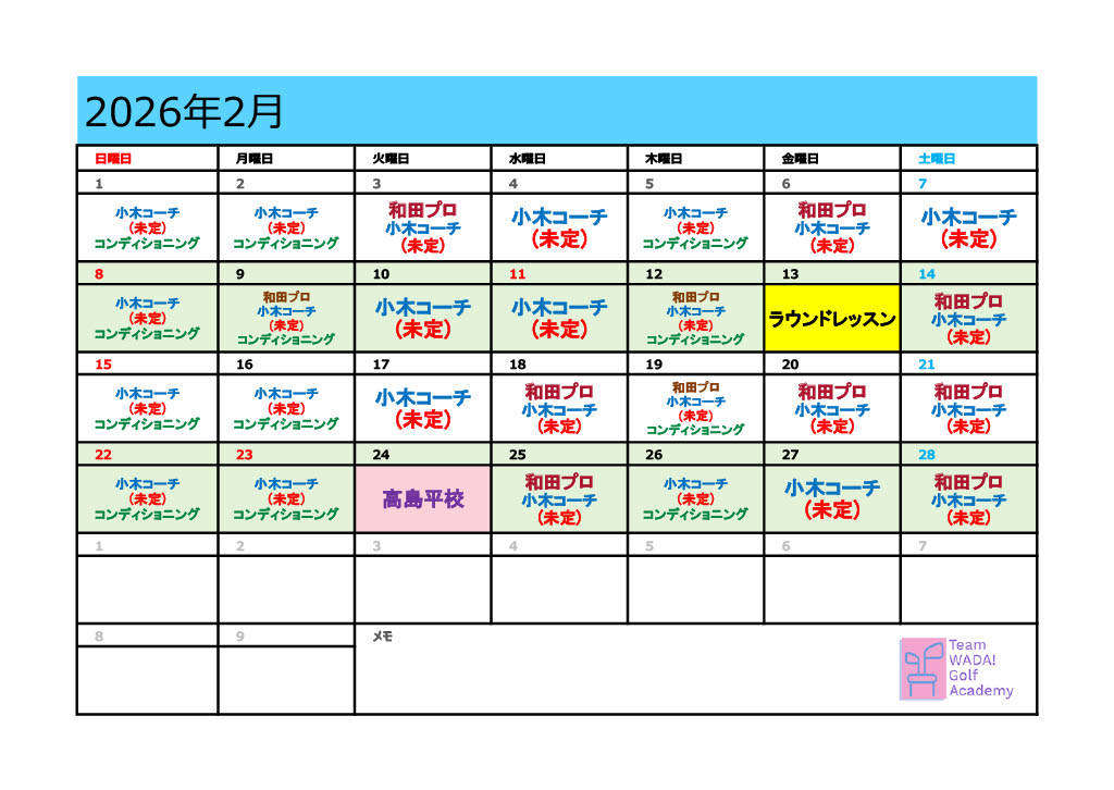 トップページ 2020.02.102026.02.24 新着情報 2024年6月1日 インドアゴルフスタジオをオープンいたします! WEB予約はこちら ≫ クリックで拡大 公式LINEアカウントができました! Team WADA! Golf Academyの公式LINEができました!以下からぜひご登録をお願いいたします! ACADEMY MENU [Team Wada] パーソナルレッスン スイング解析ソフトを用いて、マンツーマンのスイングクリニックを行います。完全予約制です。 ラウンドレッスン ラウンドでのスイング解析、コースマネジメント、ショートゲームレッスン、試合に向けてのコースメモ作成等を行ないます。 TEAM WADA プロ、研修生、ジュニアなど、プレーヤーの要求に合わせたコーチ契約です。 ムービーレッスン パーソナルレッスンの記録動画の共有、動画添削によるWEBスイング解析、会員専用の和田プロによるレッスン動画サービス INFORMATION Instagram でフォロー Team WADA Golf Academy